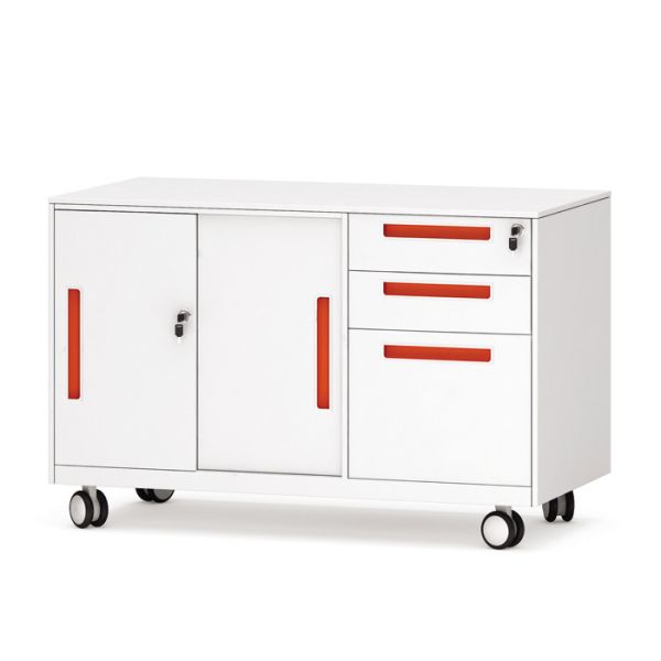 5 casters: 2 front casters with brake function, 1 auxiliary caster under file drawer prevents tipping